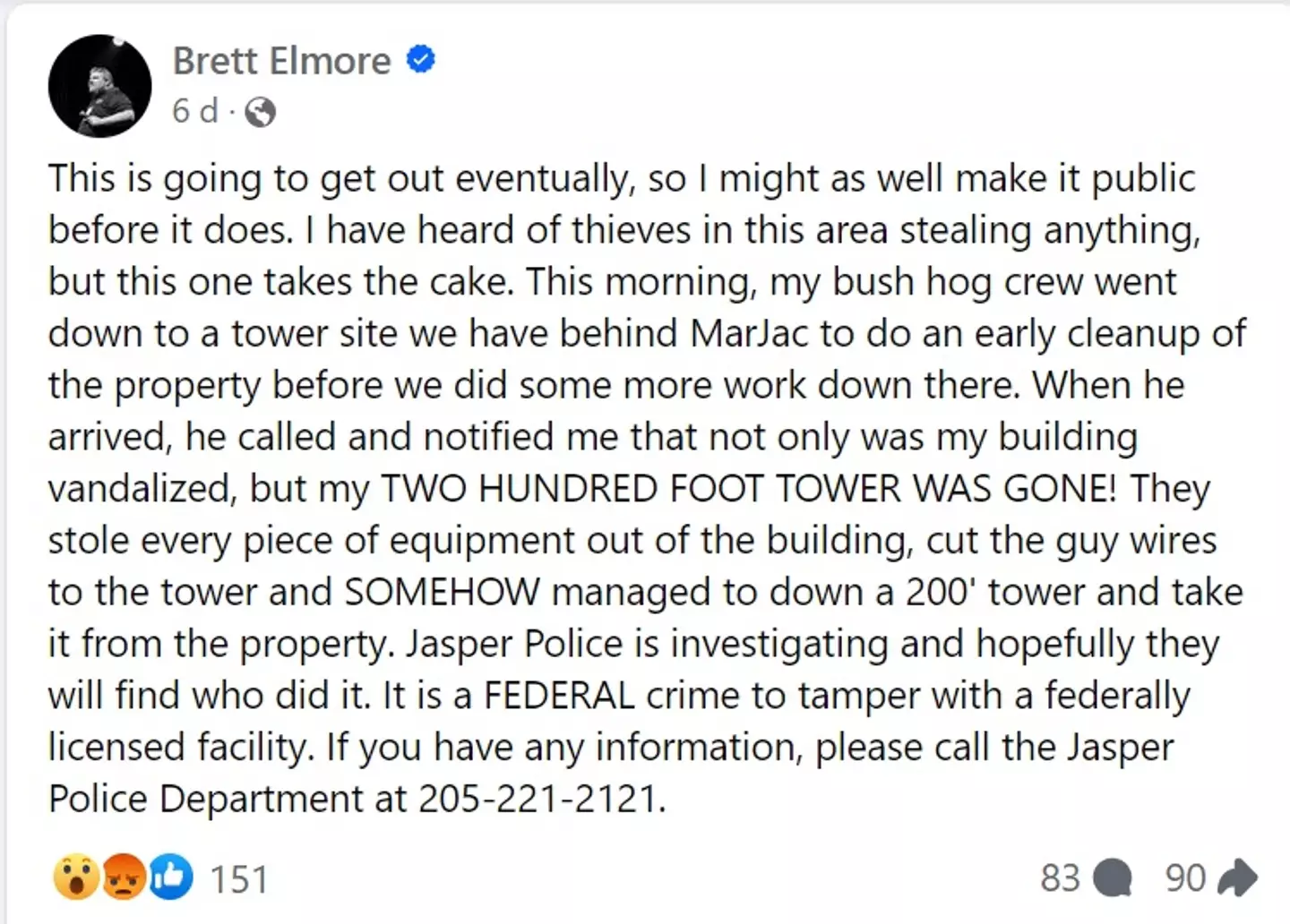 Elmore said in a Facebook post that thieves stole every piece of equipment out of the building, cut the wires attached to the tower and made off with it.