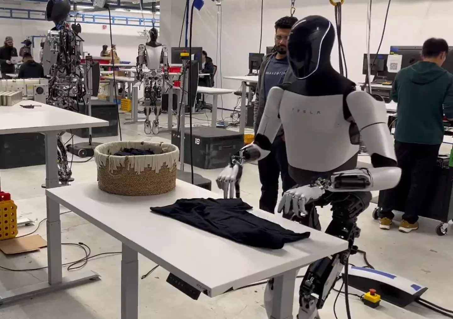 The video shows Optimus standing behind a clean table, taking a T-shirt out of a basket next to it, and then steadily folding the bit of clothing into a not-that-neat bundle.