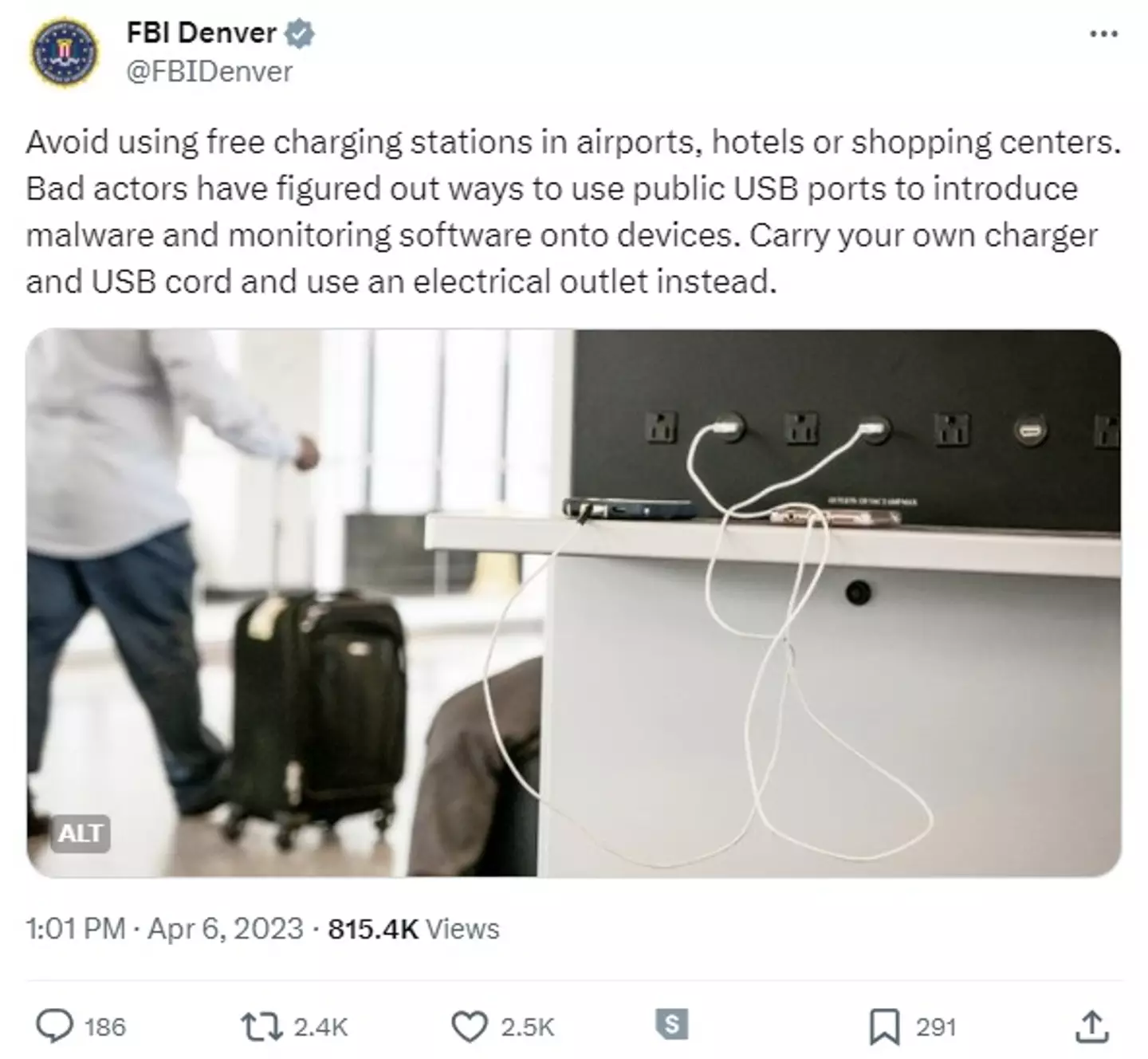 Luckily it doesn't mean you have to suffer a dead phone. Instead, the FBI in Denver added in its post: "Carry your own charger and USB cord and use an electrical outlet instead."