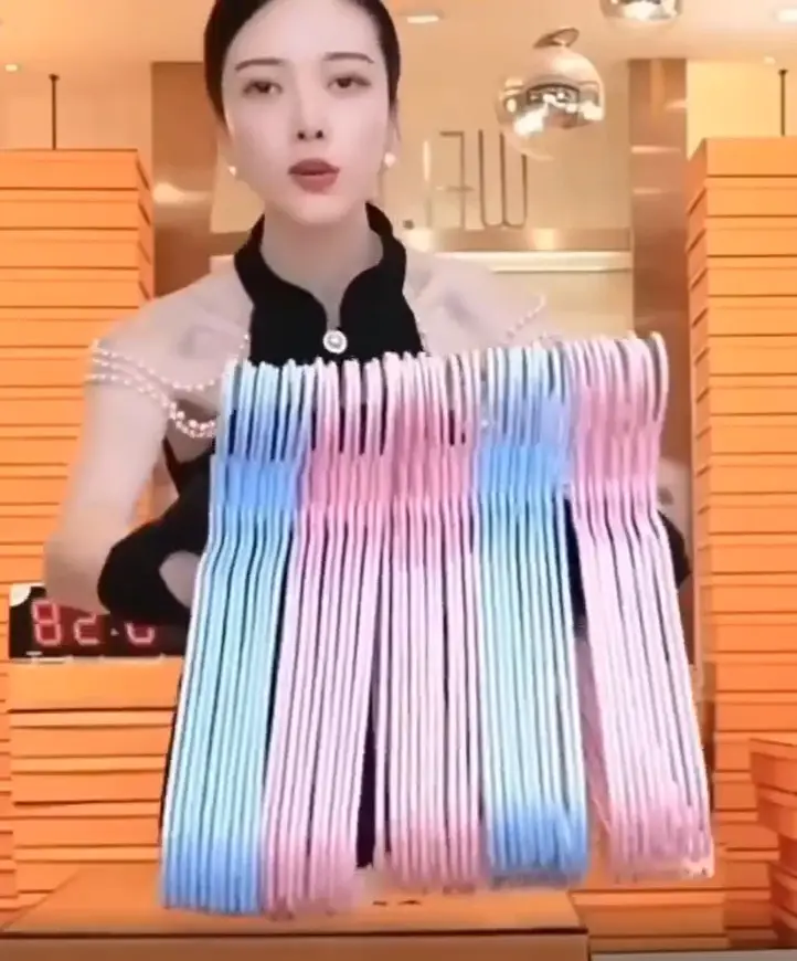 The video is less than 30 seconds long, but Zheng Xiang Xiang manages to get through a whole heap of tops, underwear, clothes hangers and even a hair dryer, each time just briefly showing it to her stream and then shoving it off her table.