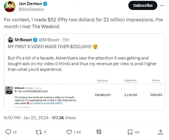 He said that a post he made gained 22 million impressions but only paid out $52, which doesn't add up to the same payment policy.