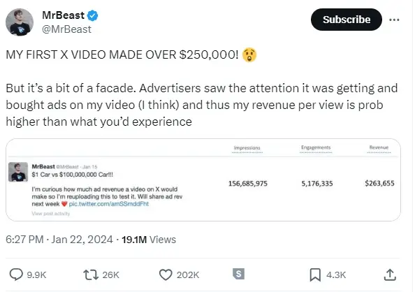 After recently doing a U-turn and actually publishing a full-length video onto his X feed, albeit an old one from September 2023, MrBeast said that he would share how much the video made him back in advertising revenue soon.