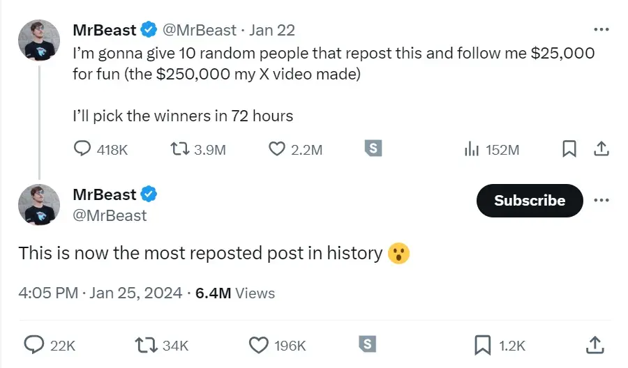 And what did he do with that cool quarter of a million dollars? In true MrBeast fashion, he didn't hold onto it for long. Instead, he wrote on X: "I’m gonna give 10 random people that repost this and follow me $25,000 for fun (the $250,000 my X video made). I’ll pick the winners in 72 hours" - which then blasted through the record of the most reposted post on X, with over 3.9 million reposts.