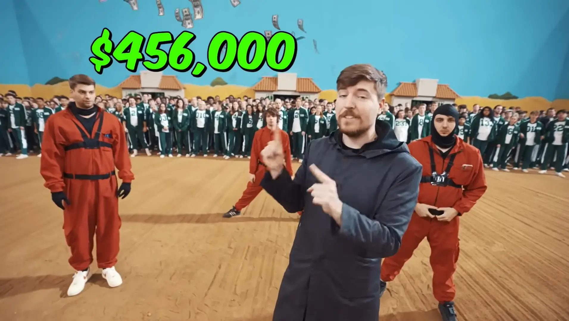 Previous YouTube videos include 'Survive 100 Days Trapped, Win $500,000', 'Last To Leave Circle Wins $500,000', and his most-viewed video: recreating every challenge from Squid Game with the winner receiving $456,000.