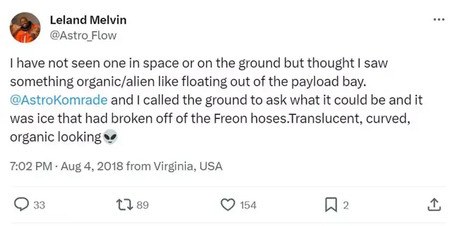 Leland replied with a funny story, detailing how he once "thought [he] saw something organic/alien like floating out of the payload bay".