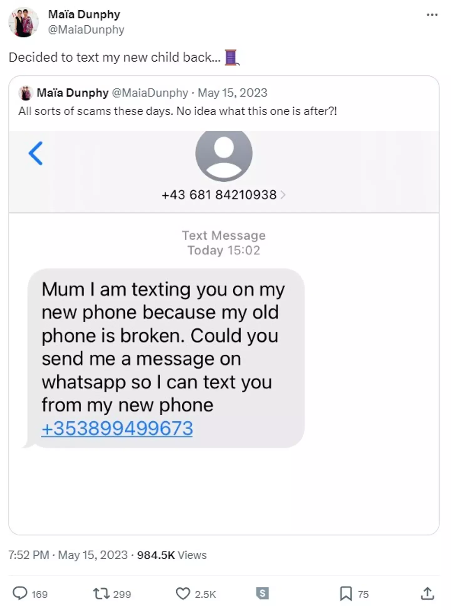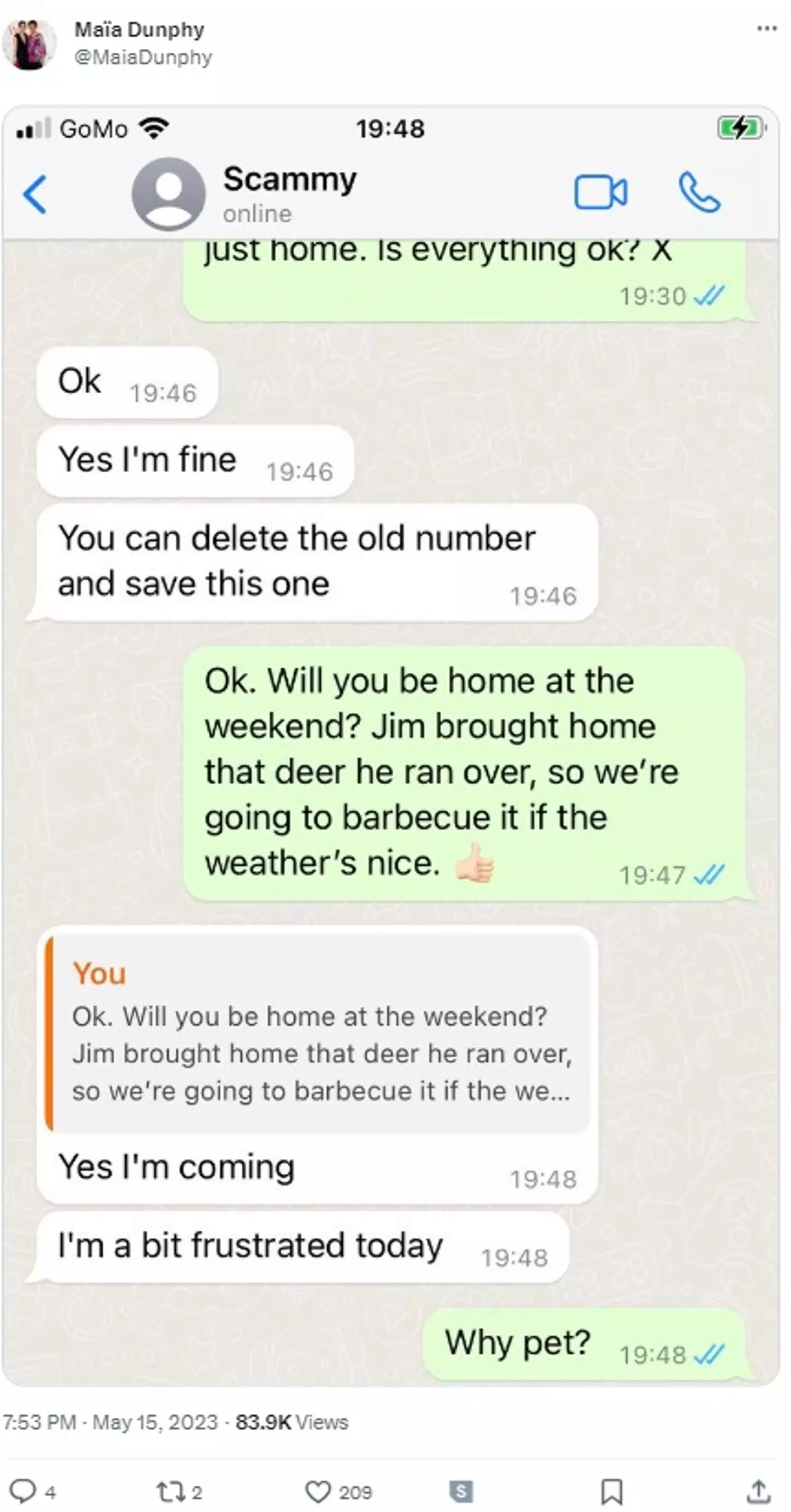 X (formerly Twitter) user Maia Dunphy went viral last year for not just replying with a sassy comeback, but entering into a lengthy conversation with a scammer trying to pose as her child.