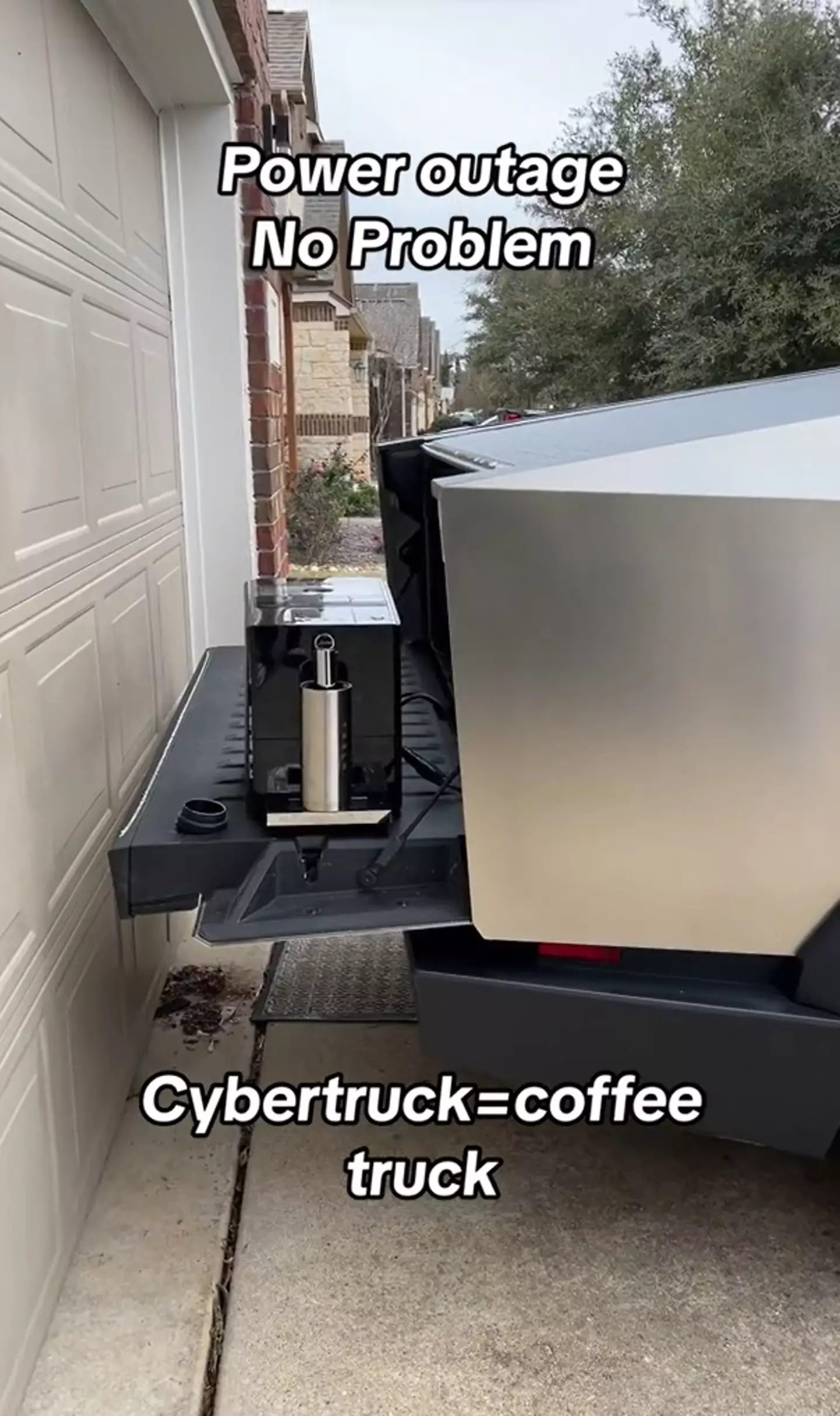 TikTok user konecteaze.com posted a video today demonstrating how they were able to use a Cybertruck's power bank to plug in their coffee machine and get an everyday luxury - even though their local power was completely blown out.